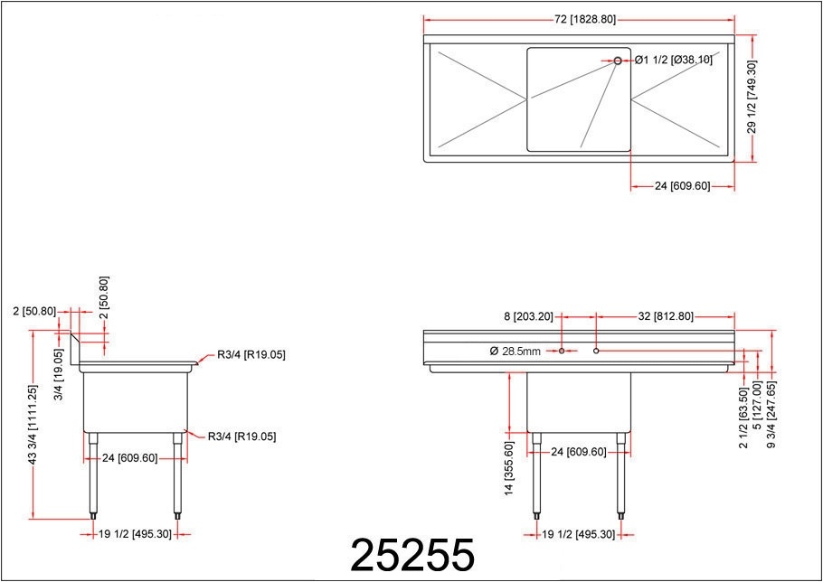 - One (1) comparment sink with LEFT and RIGHT stainless steel drain board