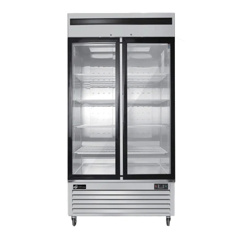 - Anti-fog dual-pane stainless steel-framed tempered glass doors